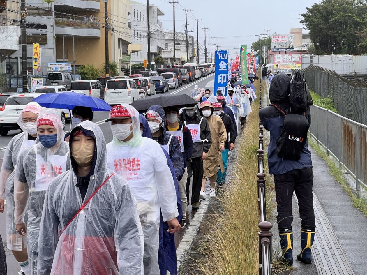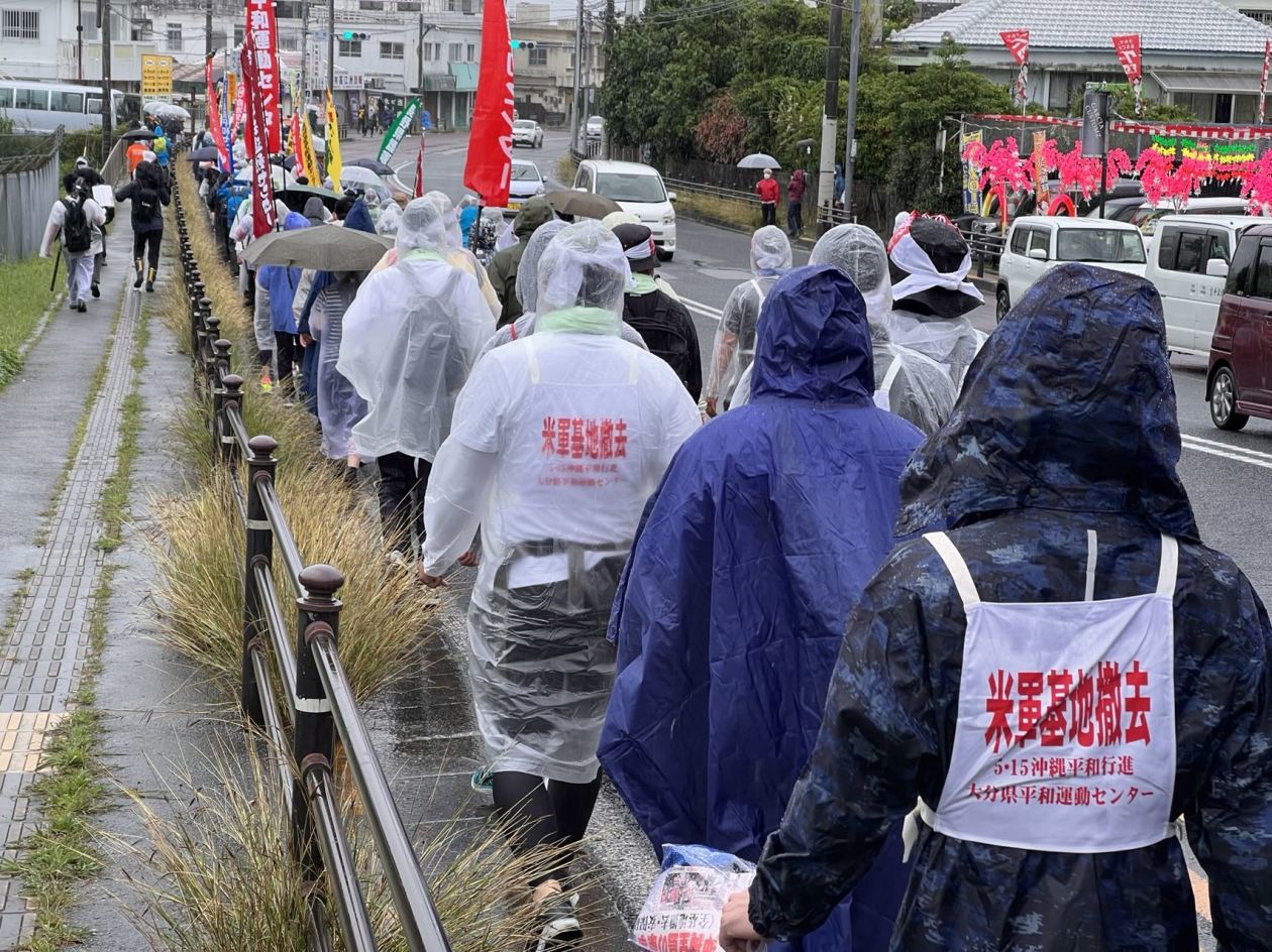 冲绳地区15日早晨开始大雨瓢泼,在举办纪念仪式的会场外,多个市民团体100余人聚集在会场正门处进行抗议示威(如图),他们高举标语横幅,高喊“不要美军基地”“阻止冲绳军事要塞化”“别让冲绳再次沦为战场”等口号,并与在现场维持秩序的警察对峙,场面一度十分紧张。示威者动情地说,今天的大雨是50年来冲绳人民承受了无尽痛苦的眼泪。