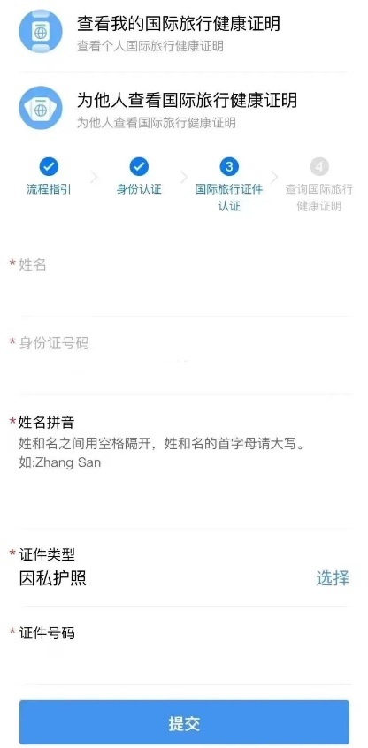 第四步:点击“查看我的国际旅行健康证明”,填写个人信息,包括姓名拼音、证件类型、证件号码,提交;