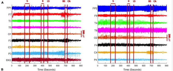 该研究由神经外科学家Ajmal Zemmar博士主导,使用最精密的脑电图设备,观测了一位87岁患了心搏骤停的老年患者,整个过程持续了900多秒,最终发现:在患者死亡前后那段区域,他的大脑发生了一系列和神经有关的脑波振荡。