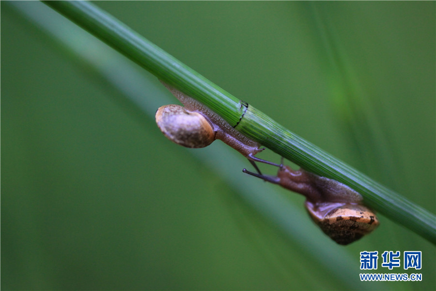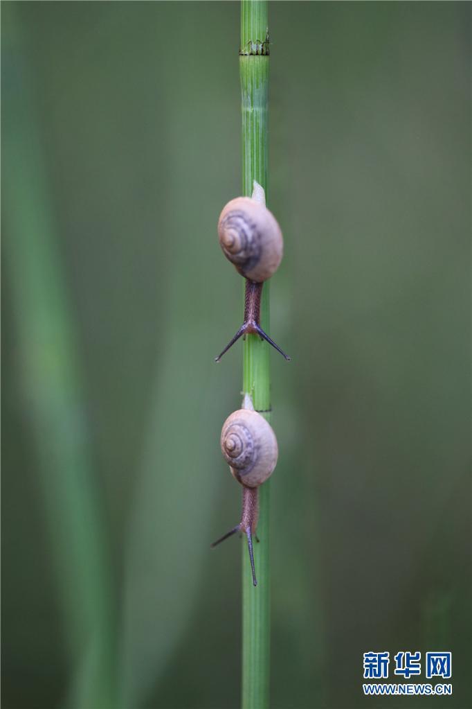 在云南省西双版纳傣族自治州景洪市郊野的节节草上,两只相遇的蜗牛互致“问候”(5月31日摄)。