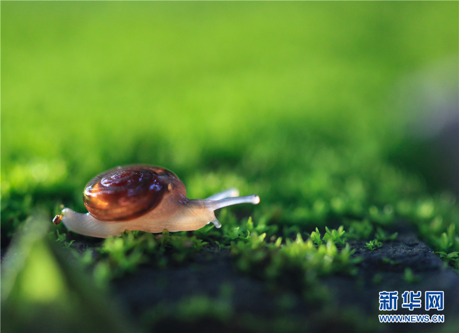 夏日黄昏,正是蜗牛活跃的时候。在云南省西双版纳傣族自治州野外、庭院角落,蜗牛出动徜徉在草丛、苔藓间,享受着夏日的时光。特别是在夕阳的映照下,蜗牛的身子也变得透明起来,甚是可爱。新华网发(李云生 摄)