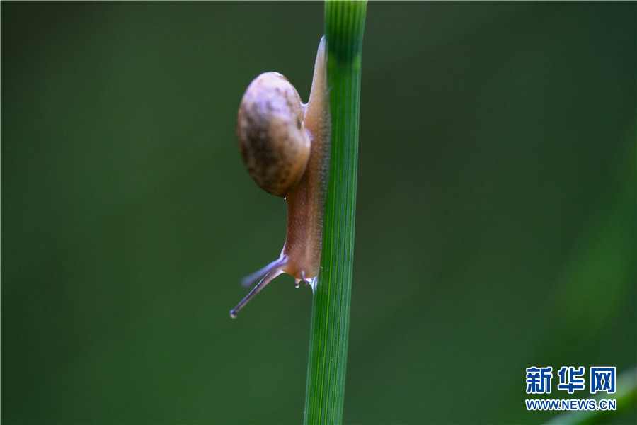 在云南省西双版纳傣族自治州景洪市郊野的节节草花上,一只蜗牛在食用雨水(5月31日摄)。