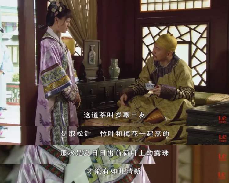 要泡这杯茶,得花多少心思?且听嬛嬛道来:“取松针、竹叶、梅花一起烹煮”,这倒还不至于稀奇,奇就奇在那烹茶的水,“那水是夏日日出前荷叶上的露珠,才能有如此清新。臣妾去岁收了两瓮舍不得喝,特意带了一瓮进宫,就埋在堂后的梨树下,前两日才启出来的。”