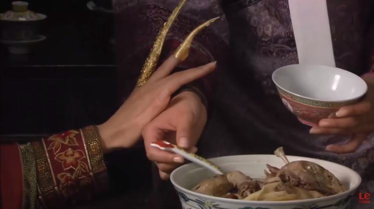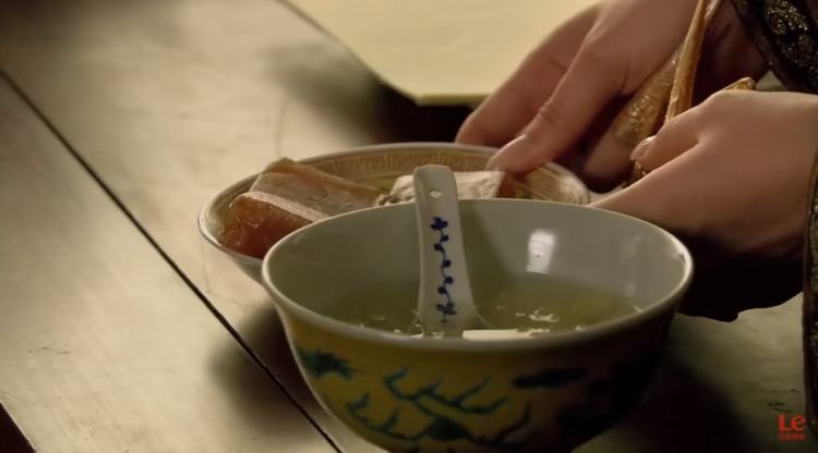 还有华妃宫里的鲍鱼烩珍珠、鱼肚煨火腿、鲨鱼皮鸡汁羹,其实这三道菜均出自清代满汉全席中的御膳,清代李斗的《扬州画舫录》卷四有载:“上买卖街前后寺观皆为大厨房,以备六司百官食次。第一分头号五簋碗十件,燕窝鸡丝汤、海参烩猪筋、鲜蛏萝卜丝羹、海带猪肚丝羹、鲍鱼烩珍珠菜、虾子汤、鱼翅螃蟹羹、蘑菇煨鸡、辘轳锤、鱼肚煨火腿、鲨鱼皮鸡汁羹、血粉汤、一品级汤饭碗。”