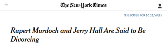 《纽约时报》:鲁珀特·默多克与杰丽·霍尔据称即将离婚