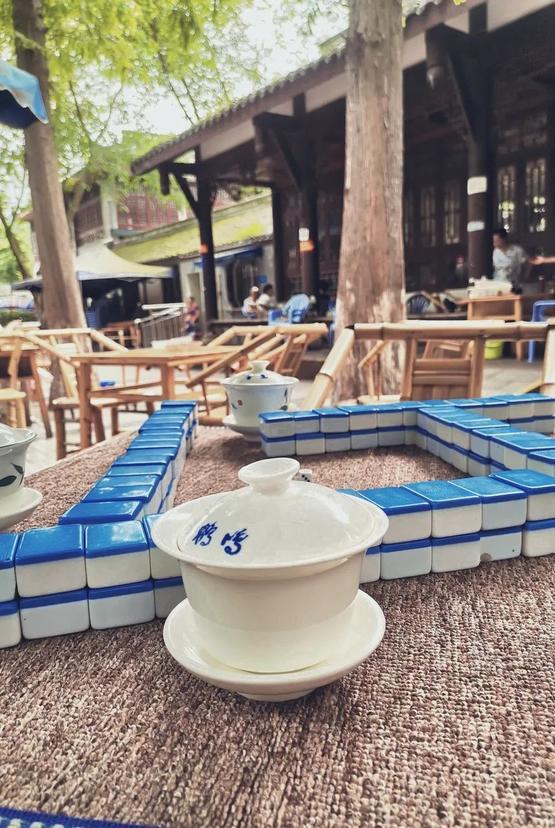 营业前,店家早早就给空杯子放上茶叶,码放整齐,只等客人一来,就能迅速安座泡茶,每桌还会配一个开水壶,方便茶客喝完后自己续水。退休的中老年是主要客户,晒着太阳眯个瞌睡,或者约上老同事老同学,摆会儿龙门阵,冲一会儿壳子,打几圈扑克牌,把下午时光缓缓消磨掉。四川的不少茶馆,也提供麻将作为消遣,麻友们凑齐,很多人一坐就是一下午,一手端茶一手拿牌,娱乐品茶两不误。