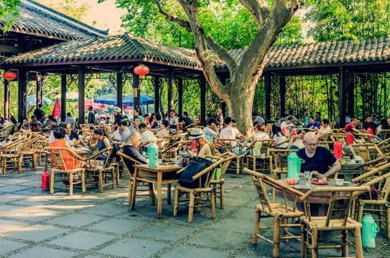 新的城市格局开始形成,茶馆也跟着一起,进行了改头换面。如今,大多数川渝地区的茶馆,在选址上一般会选露天坝子,夏天可以靠着大树乘凉,冬天则可以尽情舒展身体,躺在椅子上享受蜀地为数不多的艳阳天。
