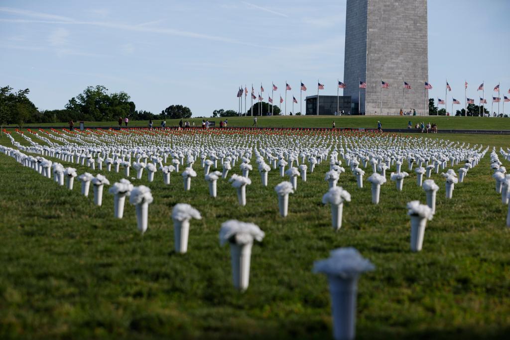这是6月6日在美国华盛顿纪念碑附近拍摄的绢花。美国首都华盛顿日前揭幕了由数万绢花组成的“全美枪支暴力纪念碑”,以悼念美国枪支受害者,展示枪患之重,要求华盛顿停止不作为。(新华社发,亚伦摄)