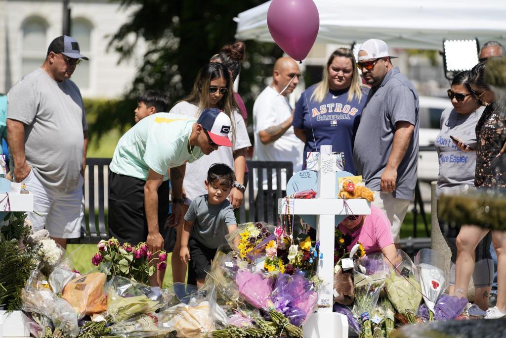 5月27日,在美国得克萨斯州南部尤瓦尔迪市的城市广场,市民哀悼罗布小学枪击事件遇害者。新华社记者吴晓凌摄