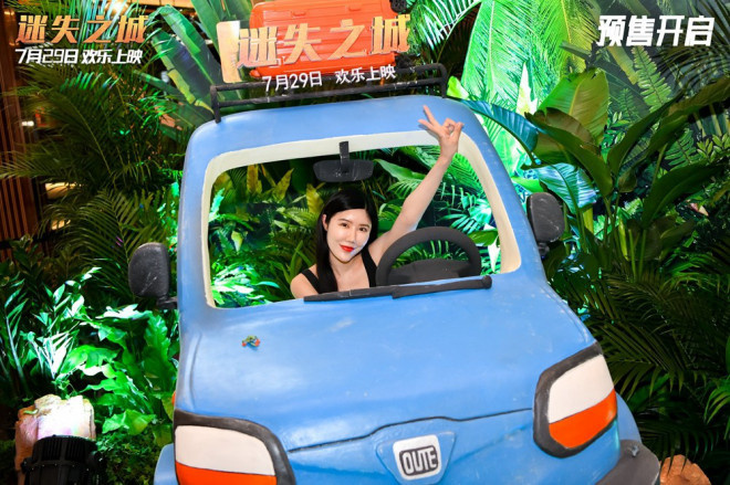 首映礼现场可谓精心设计,走进影院仿佛置身原始丛林,电影中的标志性景观被巧妙复刻,沉浸感十足。更有模特还原片中“钱老板”的经典造型,他身着宫廷风格的白色衬衫,一头飘逸的金色长发,牵一匹白马置身瀑布雨林之中,成为全场最酷炫的风景。影片中的蓝色小汽车也成为丛林的亮眼的点缀,逗趣十足,男女主正是开着它开启跌宕起伏的冒险,这对“戏精”CP九死一生,却仍不忘互怼耍宝,制造了许多笑料。此外,颇有古墓风格的飞盘游戏成为了观众互动最为热情的地方,“石墙”上嵌刻的象形符文是电影中寻找神秘古墓的关键密码,其中的无价之宝能否重见天日?静待大银幕揭晓!