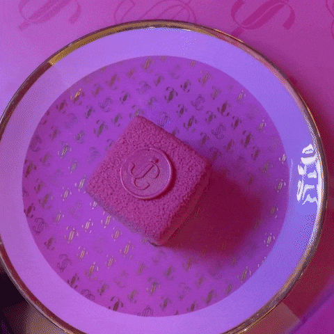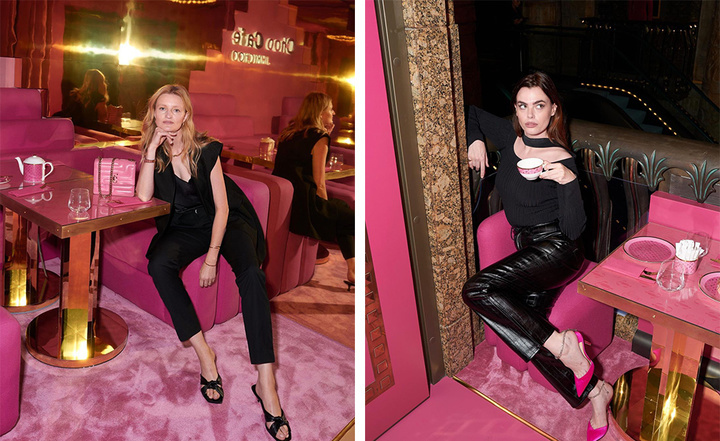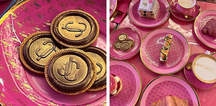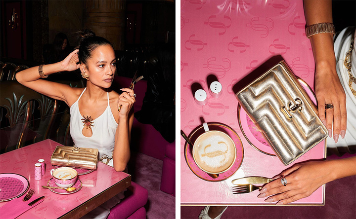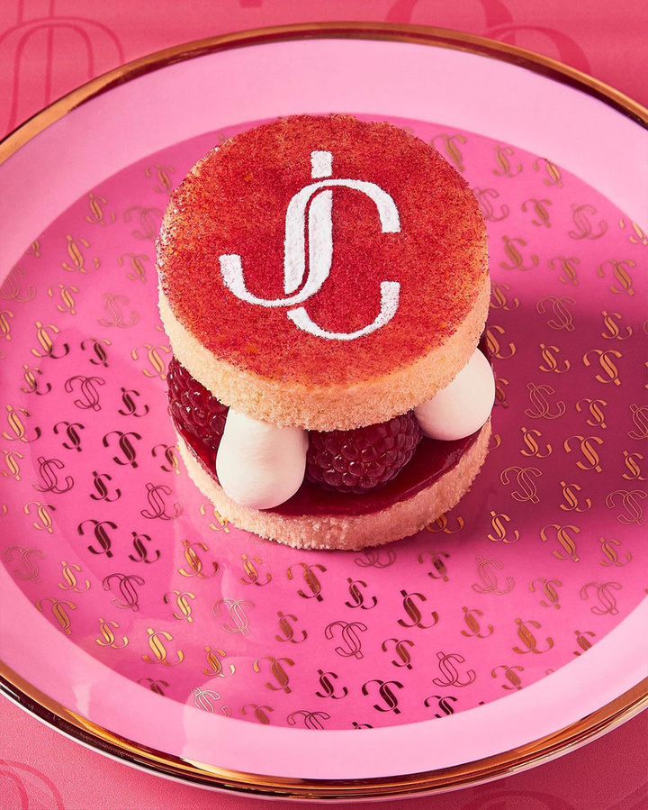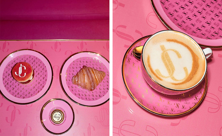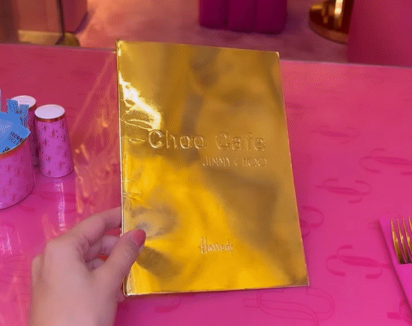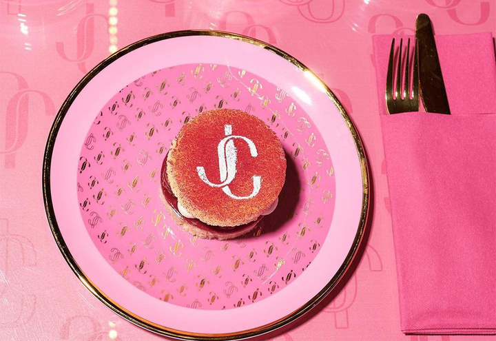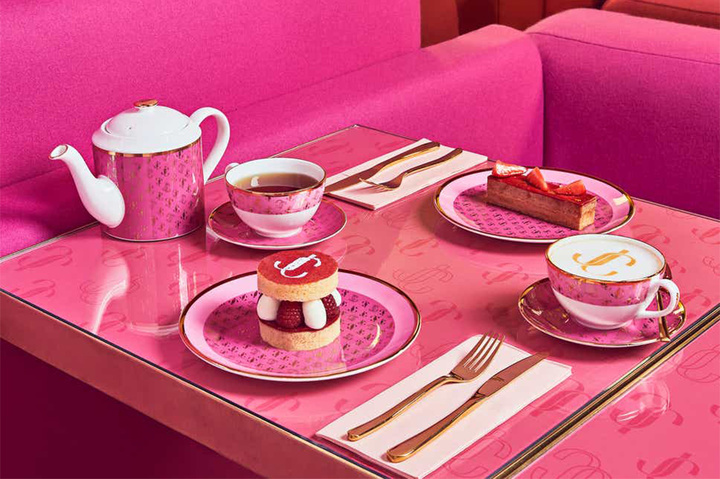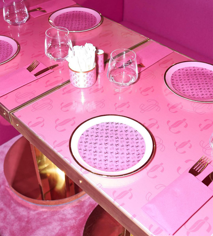 镶着金边的芭比粉桌子,还不忘间隔印上 Jimmy Choo 的镂空和实心 logo。