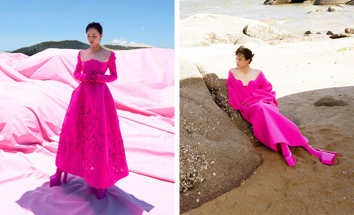 曾经穿着黑色去看华伦天奴走秀的孙俪,在《嘉人》的 8 月刊封面大片中,也换上了华伦天奴的一系列芭比粉单品,用强大的气场呈现出独属于芭比粉的力量感。