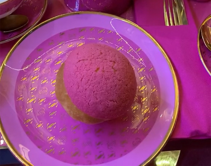 桌上放着的糖包罐和调味瓶,和接下来上菜用的餐盘,也延续了芭比粉、logo 图案和金边的设计。制作材料采用了上好的骨瓷,由当地拥有 130 多年历史的 Duchess China 1888 公司定制而成。刀叉也用芭比粉布块包好,放置到桌子一边。