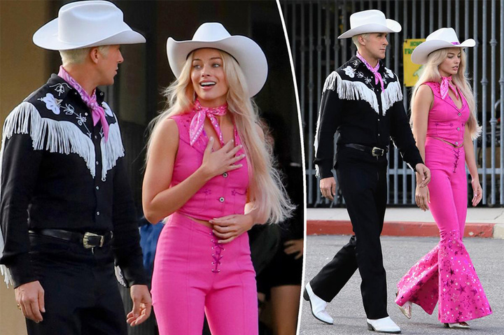 《芭比》在威尼斯海滩的片场被粉丝们偷拍了一些照片中,曝光的两套情侣造型也很芭比粉。
