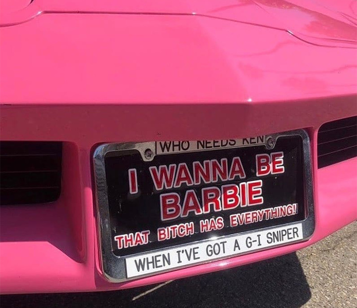 她的男友肯也在芭比粉柱子前来了张定妆照——一整套 Calvin Klein 的经典牛仔套装,只不过故意露出的内裤边上的 CK 图案 logo 换成了肯的英文名 Ken。健美身材的肯,也要来做内裤品牌了吗?