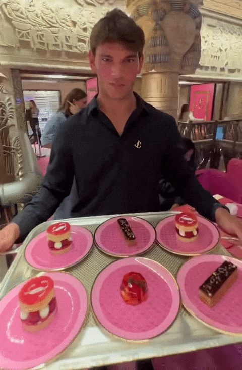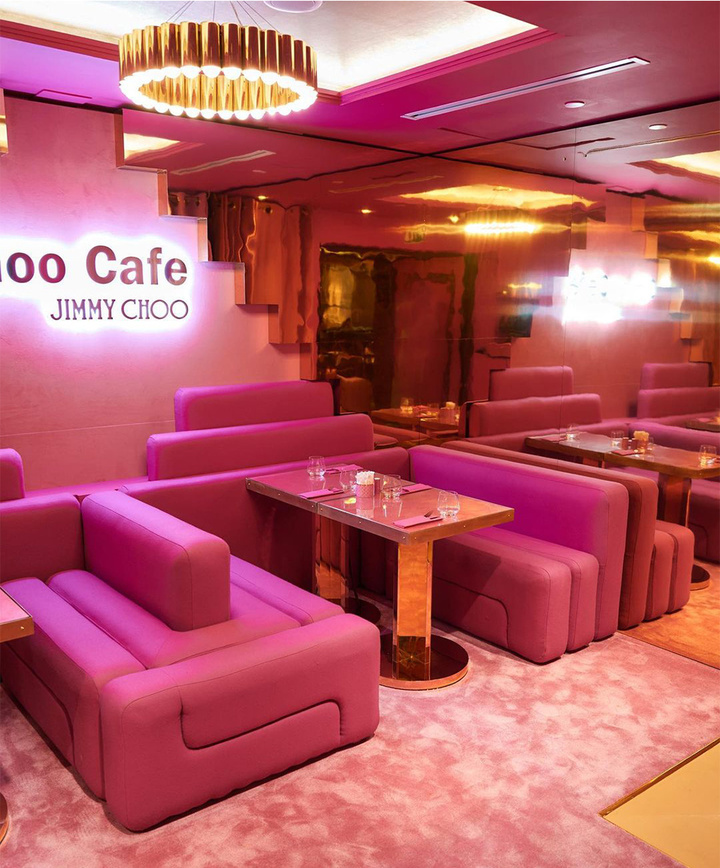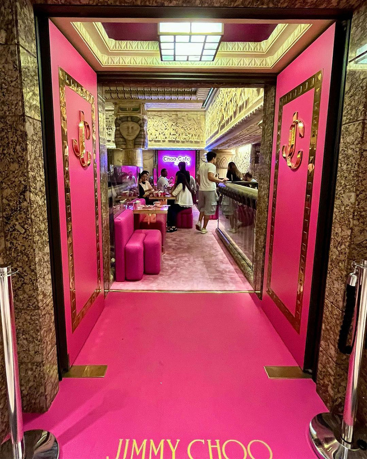 粉色大门镶上 Jimmy Choo 的金色 logo 和铆钉边框,粉色地毯印上 Jimmy Choo 的金色字母——这就是 Choo Café 的入口,连接着 3900 平方米的「芭比粉梦境」。