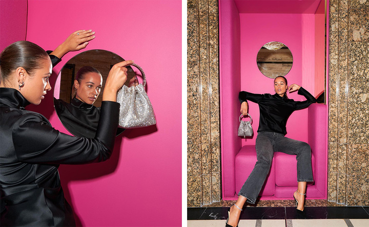 产品展区,陈列着 Jimmy Choo 今年秋季系列 Varenne Avenue 皮包。不仅仅是包包,为了助力芭比粉,Jimmy Choo 最近还推出高跟鞋、运动鞋等产品。