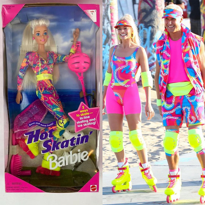这一套滑冰造型,借鉴了 1994 年的 Hot Skatin 系列芭比娃娃。荧光绿的护膝将芭比粉衬得更加亮眼。