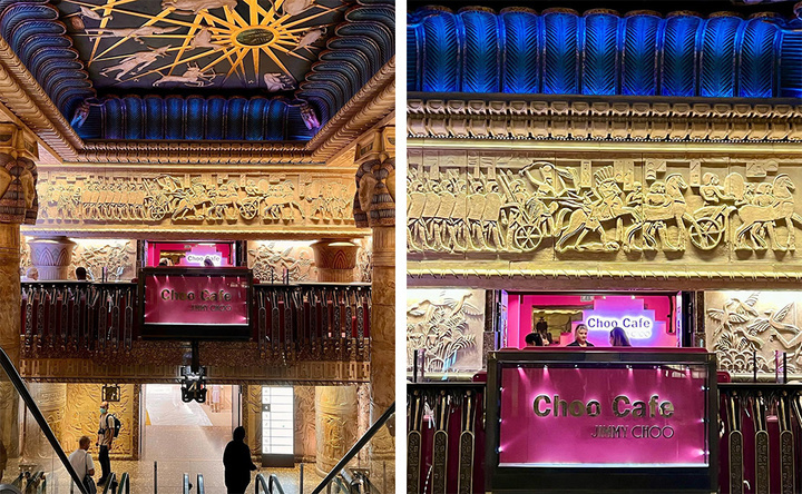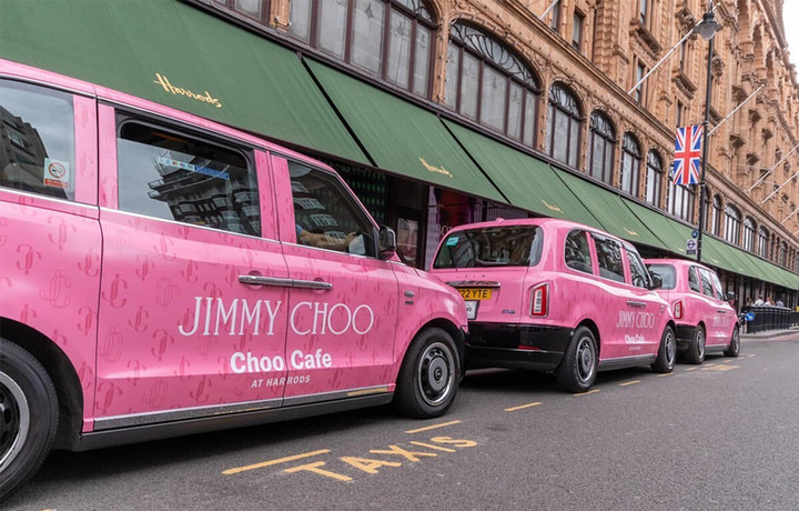 在哈洛德百货的 Jimmy Choo 店里挑选完漂亮包包和鞋子,出门走几步就能看到闪烁着粉色光芒的 Choo Café 大招牌。这样的芭比粉灯光在古色古香的建筑里,想忽略也并不容易。