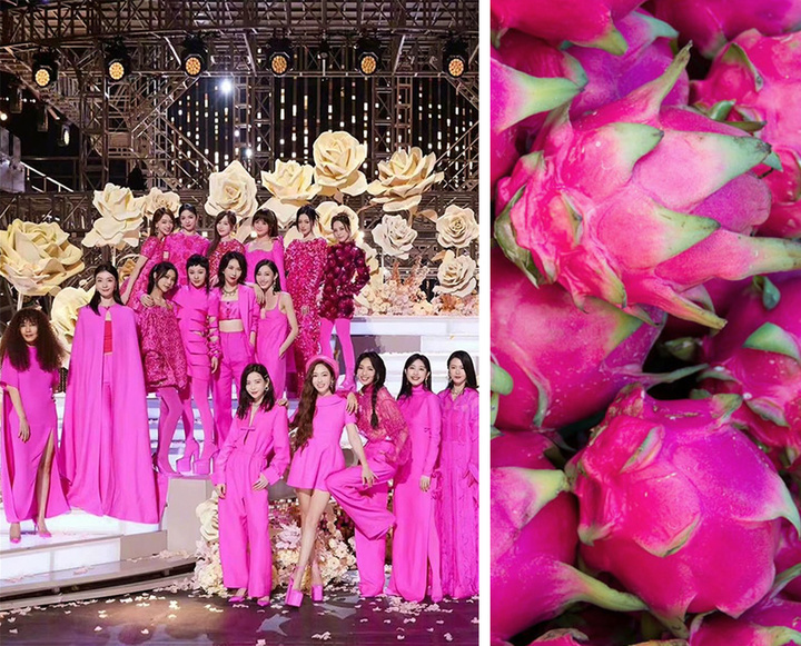 Barbiecore 落到颜色上,有个我们更熟悉的名称——死亡芭比粉,以及微博热搜 #浪姐 火龙果色#——8 月 5 日,《乘风破浪的姐姐》成团夜上的 17 名决赛选手穿上了赞助商华伦天奴 Valentino 提供的礼服,粉成了一大片。