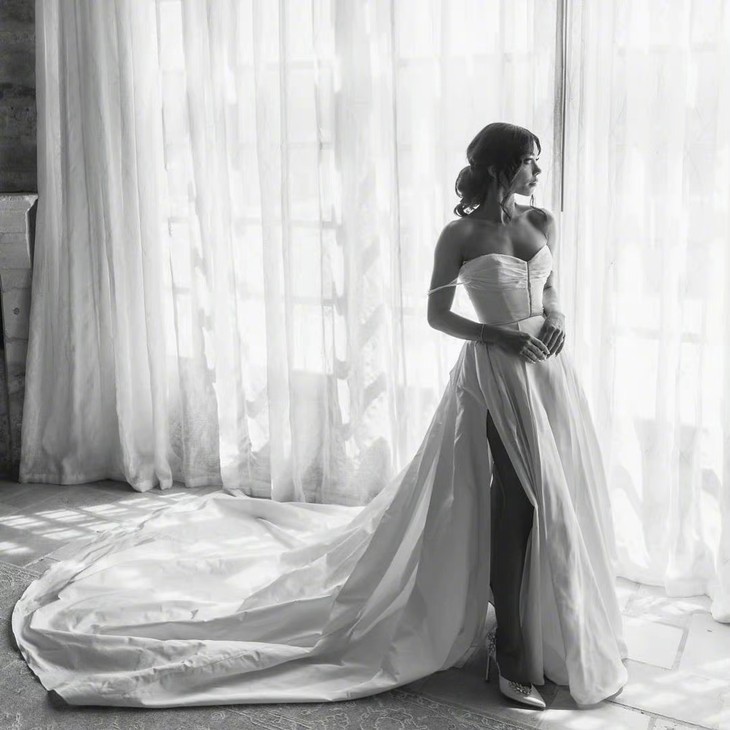 身着Vera Wang婚纱的大姐极具电影感和艺术气息,纯白的高开衩婚纱,满满的意式风格,更衬得大姐甜美可人又颇具风情。