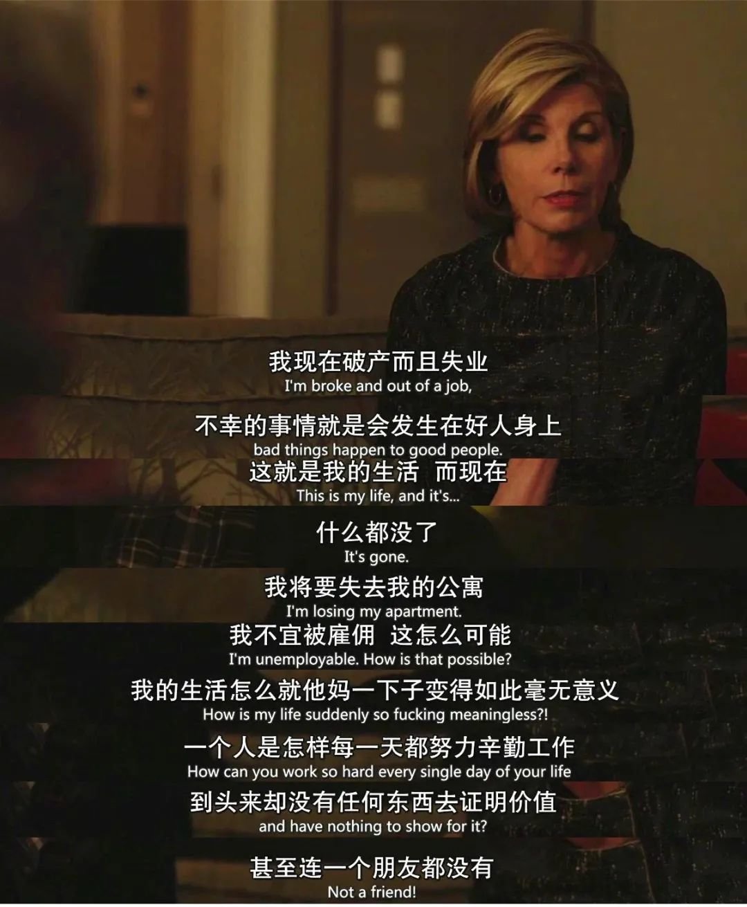 剧中的Diane Lockhart无疑活成了所有职场女性幻想中的那个样子。几十年的职场奋战让她成为了整个律师界行业顶端的精英分子之一,也拥有了让人艳羡的财富、地位、名誉。