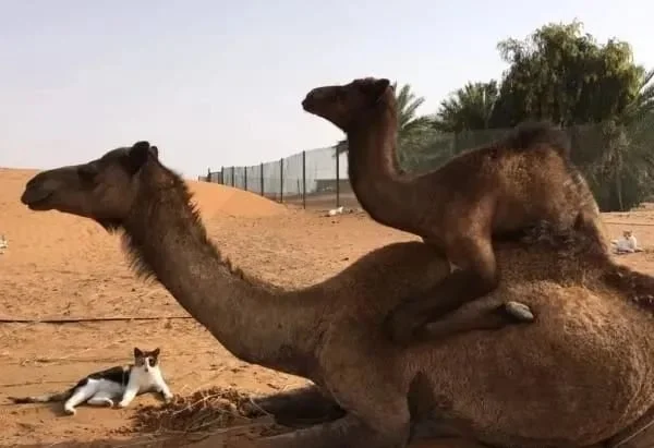 小骆驼趴在大骆驼身上,猫咪看到后也没忍住,
