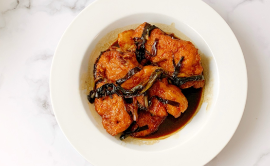在上海本帮菜里,葱和肉最常见的搭配,当属浓油赤酱的“葱烤大排”、“葱烤鲫鱼”。“烤”其实应写成“㸆”,不是直接放在火上烧烤,而是用少量的水将食材煨熟,汤汁收干,既入味又软嫩。与大排、鲫鱼同㸆的小葱绝不能吝啬用量,要与身为主料的肉的重量相同,才能让葱香尽可能地渗入。将大排吃完,盘底沾满油脂汤汁、变得软趴趴、黑乎乎的一团小葱其实是精华所在,老饕不会放过用它拌饭、拌面的好机会。