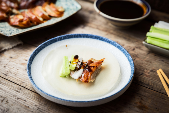 北京烤鸭如果只有薄面饼裹鸭肉片,显得过于油腻,有了葱丝、黄瓜条和甜面酱的调和,才能吸引人吃得停不下来。