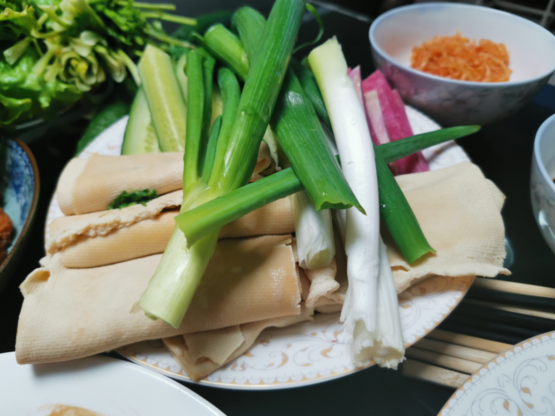 京酱肉丝也与之类似,将葱丝和加酱炒的嫩肉丝一起裹在干豆腐中吃。这种吃法令人联想起,古人过立春时,习惯用薄饼卷着五种切丝生食的辛辣蔬菜食用,叫做“五辛盘”,又名“春盘”,葱就是五辛盘的重要组成部分。现在北方过立春吃的春饼里,裹的菜已经换成了韭菜粉丝豆芽鸡蛋合炒的“合菜”和多种口味的酱肉,但整根的生葱却始终不变。