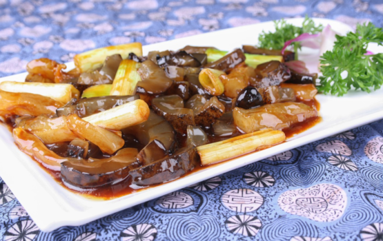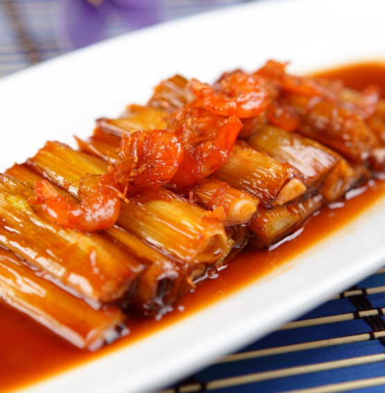 葱生吃固然可口,作为主要食材做熟吃,同样魅力不减。许多人知道葱能成为主菜,都来自于汪曾祺的描述:“王世襄来了,提了一捆葱。他做了一个菜,焖葱。结果把所有的菜全压下去了。”王世襄之子王敦煌在《吃主儿》中写了详细的做法:“海米适量用水(或加酒)发好。加酱油、姜末、盐、味精、料酒适量调成汁,取肥硕的大葱白切段,下温油中炸软,捞出码好,与调味汁下炒锅中烧一下,使之入味即可。”