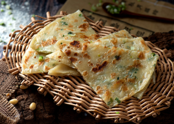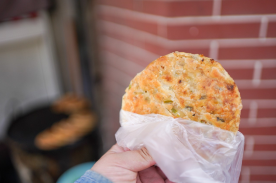 南北均有的葱油饼,就是在这种思路下诞生出来的。北方叫“葱花饼”,面饼擀薄,撒大量葱花和盐,卷起再擀,反复几次,才能使得烙出的饼富有层次,酥脆耐嚼。梁实秋总结为:“层多,葱多,而油不太多;锅要热而火要小”,烙好的饼通常和锅的底面大小相仿,需要切块再上桌。