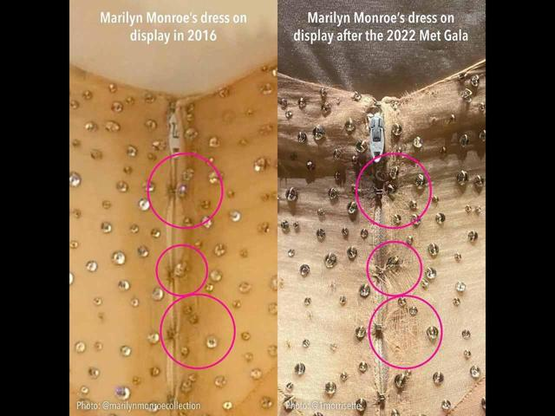 虽然后面博物馆出来给金姐辟谣,称裙子当年拍得的时候就已经有轻微损伤。但是网友不买账,后续翻出更多的BA照力证其他部位也有很大程度的损坏。