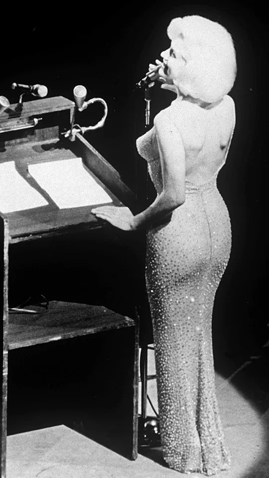 这件大胆诱人的裙子,是梦露专门为了小肯尼迪生日会专门定制的,梦露计划在总统的生日会上,为他献唱生日曲时穿着。
