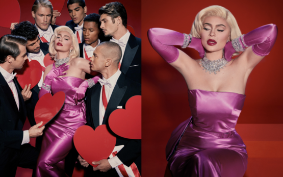一身芭比粉绸缎礼服,手腕和脖颈缠绕满闪闪的钻石。