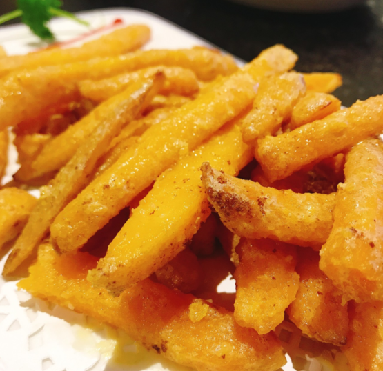 红薯切宽条裹上淀粉炸熟,可以撒上甘梅粉,做成甘梅地瓜条,配盐酥鸡块最好吃了。也可以调一碟或甜或咸或辣的蘸酱。