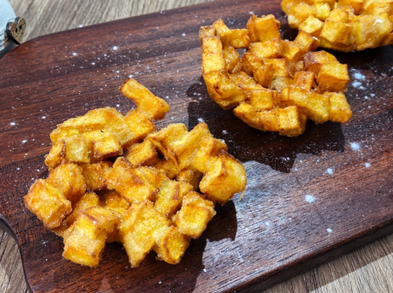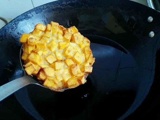 红薯丁蒸熟了再裹上淀粉,在油锅里煎成地瓜烙,既能当主菜也能当零食。