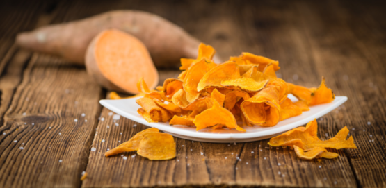 红薯切成薄片油锅炸熟或烤箱烘烤,变成酥脆的红薯片。