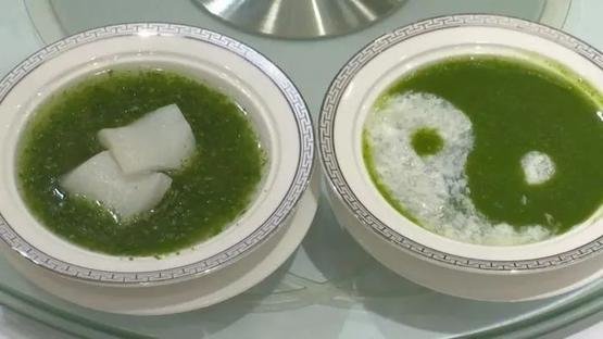 在广东、香港、澳门一带的潮州菜馆,有一道名为护国菜的主打汤,是以新鲜的番薯叶、北菇、火腿茸和上汤制成,汤色深碧,翡翠溶光,清香鲜滑,嚼齿留香。这道菜用油很重,滚烫的汤汁被油质封面,热气不散,用小勺划开了才能小心尝到汤汁的鲜美。