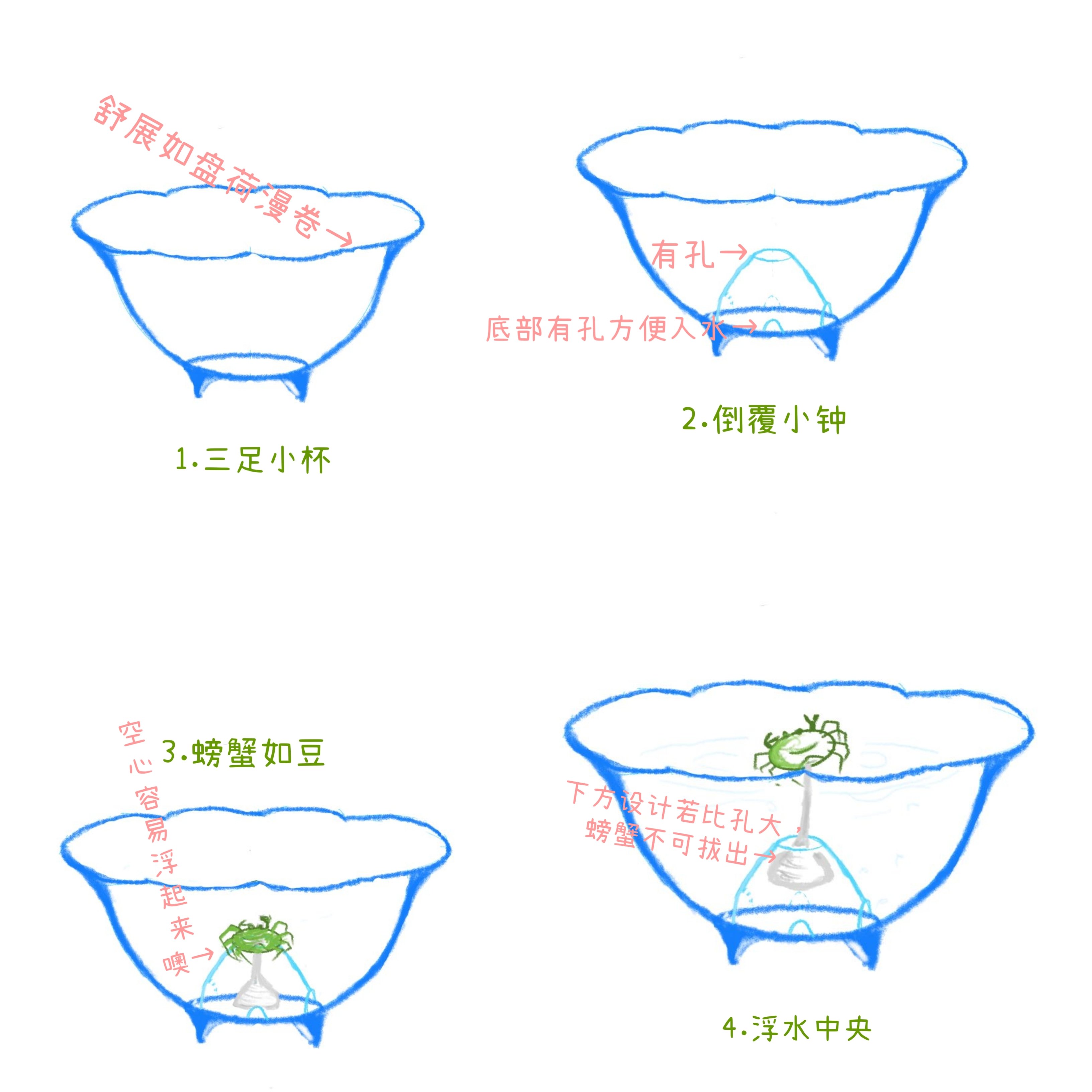 若要瓷偶浮在水上,并不一定要物体密度比水小,可以制成中空结构以增加排水体积。按阿基米德原理,只要此物体排开液体的体积足够大,就算物体密度比水大也同样可以浮起来。古文里未明说的“关捩”,便是实际制作时在瓷偶足按上薄瓷空心的浮子,或者将螃蟹也做成空心的。