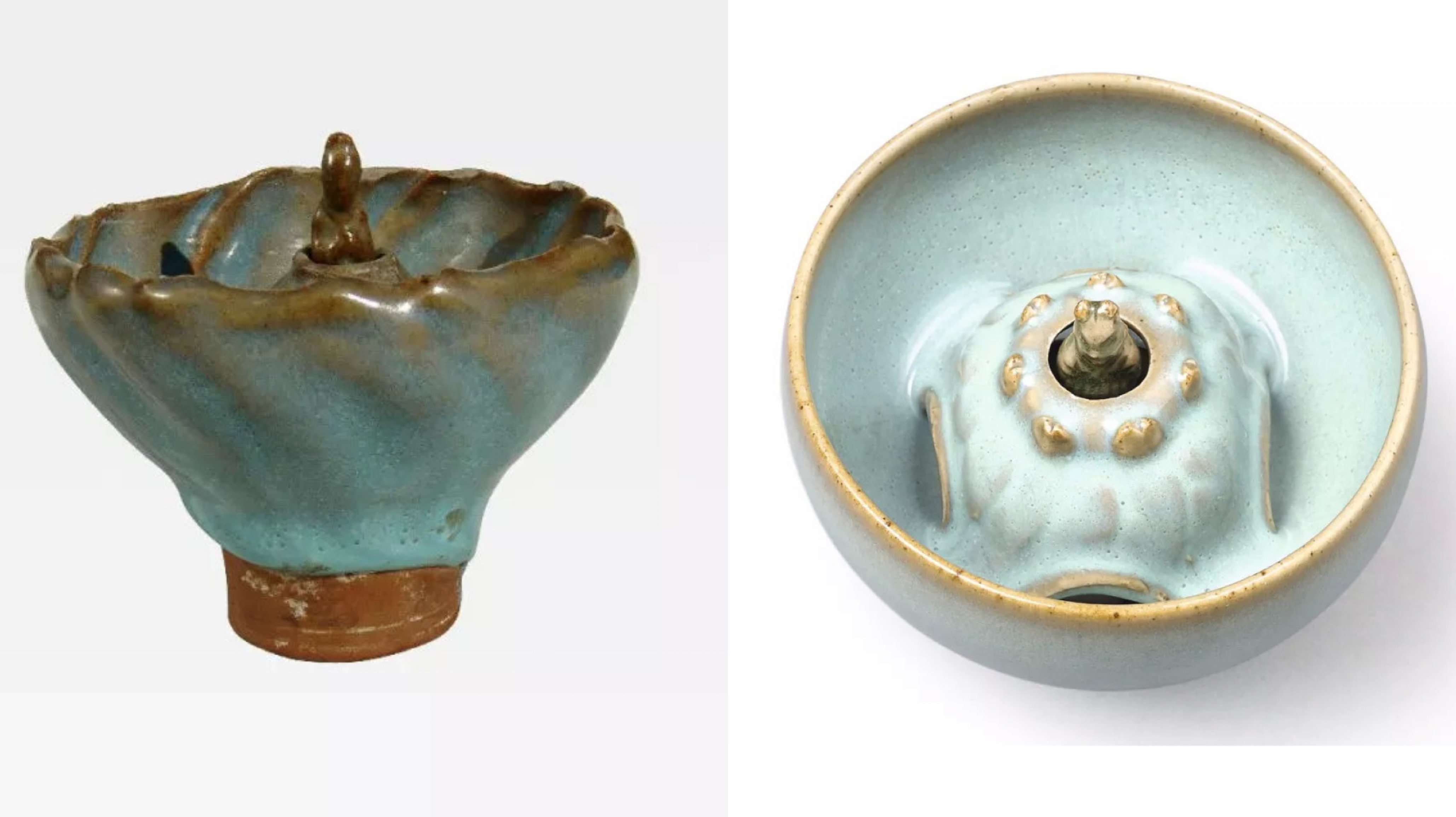 元人吴存有诗曾道:“折苇枯荷绿一洼,游鱼戏蟹小生涯”。杯盏中使用鲤鱼、螃蟹、乌龟、水鸭元素做装饰,在古代酒器设计里并不少见。明清荷叶吸杯,不少会捏塑鱼蟹之类,贴合的位置恰恰好遮蔽管茎穿杯的孔洞,迷你可爱。但像开封州桥这件活灵活现的小螃蟹,实是罕见。