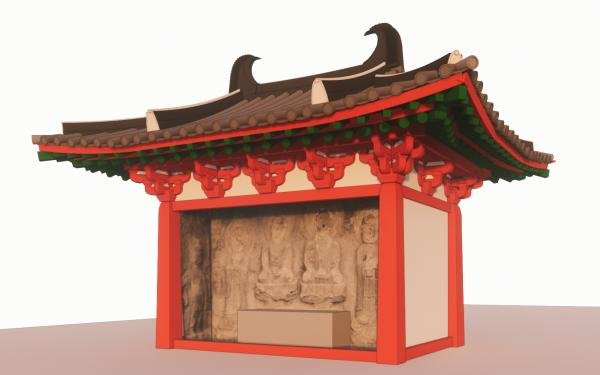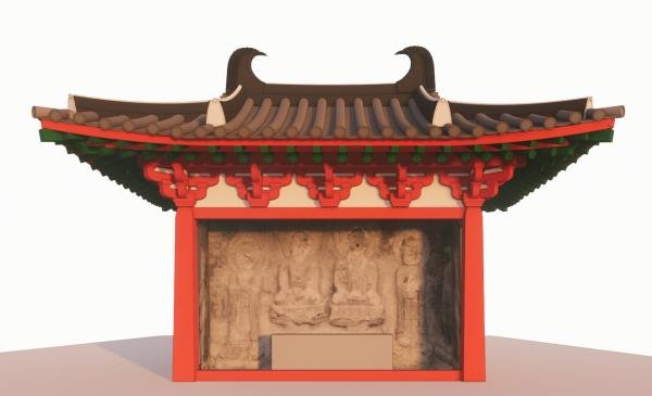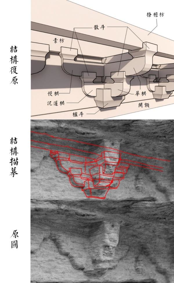 梁思成心心念念想寻找的唐代石窟窟檐,是近现代考古和建筑学家们用以研究和复原古建的“密码”,相对壁画描绘的二维建筑,石窟窟檐更像三维模型,写实度高,细节更严谨可靠。但由于石仿木建筑雕刻难度大,不但需工匠有高超的石刻技艺,也要对建筑法则有相当造诣,且斗栱雕刻环环相扣,稍有不慎便前功尽弃。所以在中国几千处石窟中,遗存带斗栱的仿木建筑形象凤毛麟角。