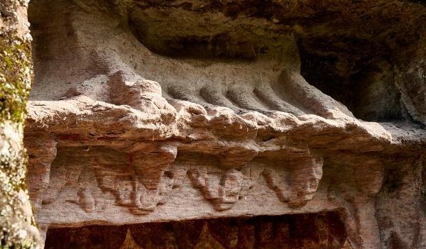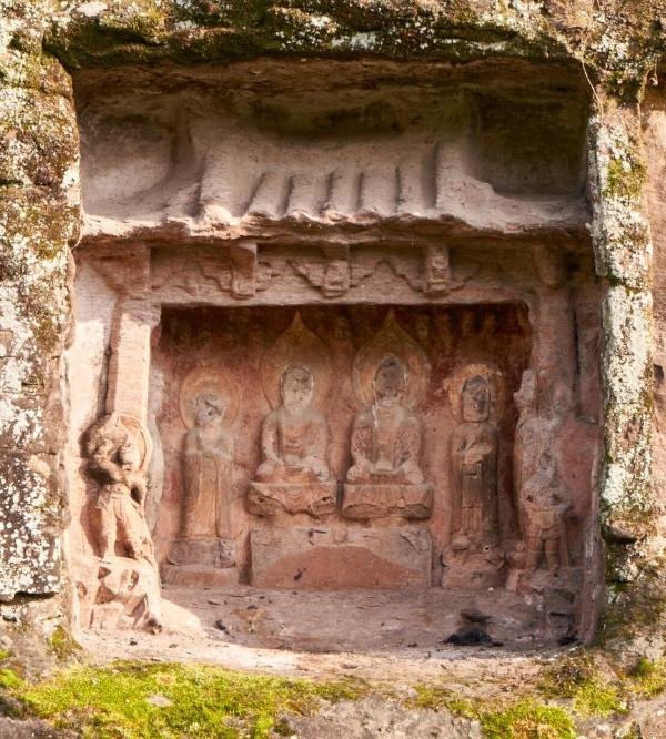 笔者在四川安岳县发现一龛唐代建筑窟檐。这是一处未被现代妆彩和破坏的小型石窟寺,共4龛,均为矩形双层窟,内容为二教题材,造像还保留着清代的矿物质妆彩。