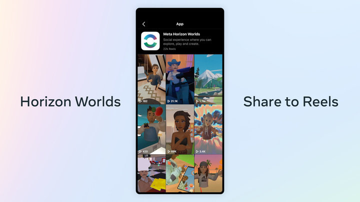 其次,你能在 VR 社交平台 Horizon Worlds 上拍摄视频,并将其分享到 Facebook 和 Instagram 的短视频功能 Reels,「就像在现实世界中拍摄照片或视频一样容易」。