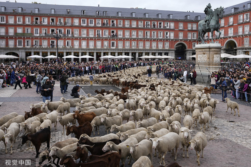 10月23日,西班牙马德里,一群羊被赶过市中心的广场。(视觉中国)