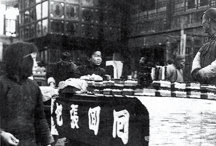 茶汤面是用糜子面做成,一般兼卖油炒面儿、藕粉。三种吃食都是用开水冲的,只是茶汤、藕粉需先用少许凉水搅好,再用放置在大铜壶中的开水冲开。冲好后,撒上去皮的芝麻仁儿、松仁儿、核桃仁儿以及青丝红丝、山楂条儿等,再加上糖(藕粉只用白糖,茶汤、油炒面儿多用红糖)和桂花汁。有固定摊位售卖的,也有串街走巷流动售卖的。吆喝:“咦噢喂茶啊汤啊!”