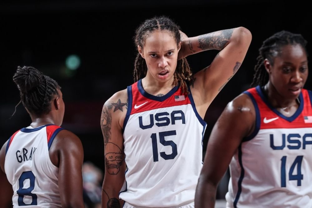 2021年8月6日,美国队球员格里纳(中)在比赛中。(新华社记者潘昱龙摄)
