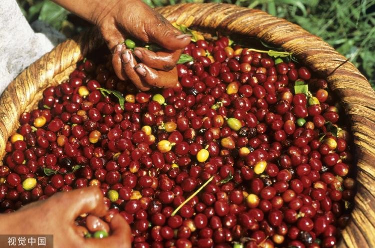 篮子里的新鲜阿拉比卡咖啡果。/视觉中国
