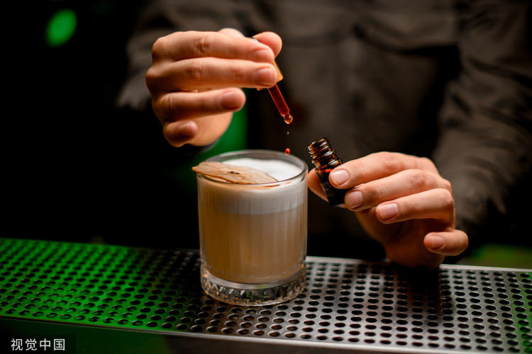 鸡尾酒杯中,调酒师小心地用移液管加入一滴香精。/视觉中国