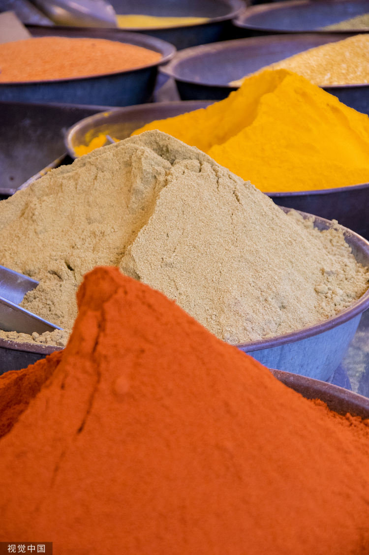 印度拉贾斯坦邦焦特布尔的Sardar市场,五颜六色的香料。/视觉中国